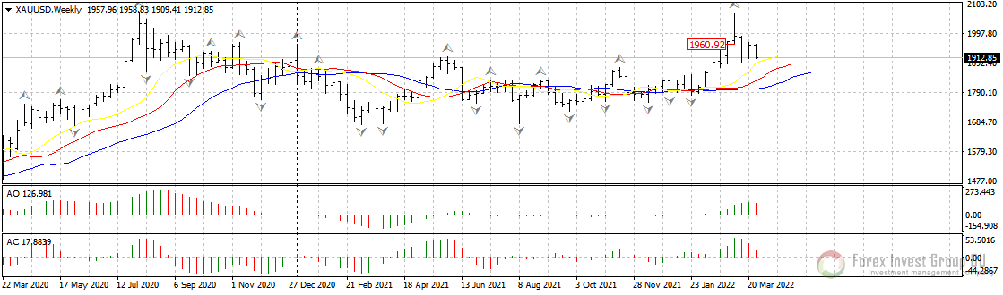 Молниеносное укрепление драгоценных металов к историческим максимумам было прервано в начале марта. Так, по золоту имеем разворотный бар на продажу на недельном таймфрейме с точкой входа у 1960.00. На данный момент сигнал в отработке, но продавцы xau/usd столкнулись со значимой поддержкой у линий аллигатора на недельном таймфрейме. Судя по всему, диапазон 1900.00-1890.00 станет определяющим для дальнего ценообразования по паре. Если покупателям золота удастся удержать данные отметки, ждем продолжения роста как минимум к 2000.00. В противном случае возможна более глубокая коррекция, которая может затронуть 1870.00-1800.00. Важным для пары будет сегодняшняя публикация индекса доверия потребителей США за март.
