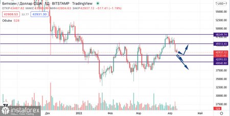 Альтернативным сценарием для BTCUSD остается пробой уровня в 42 000 долларов з монету и падение к 40 000 долларов за один биткоин.