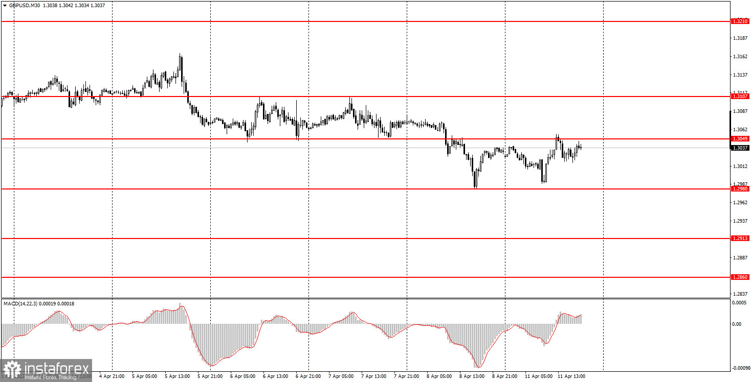 Пара GBP/USD в понедельник также двигалась внутри ограниченного бокового диапазона. Между уровнями 1,2980 и 1,3049. Таким образом, речь идет также о 70-пунктовом боковом канале. Однако, в отличие от пары евро/доллар, у пары фунт/доллар был сегодня макроэкономический фон. Возможно, он был не настолько сильным, как многие рассчитывали, тем не менее определенную реакцию рынка он спровоцировали. В Великобритании сегодня были опубликованы отчеты по ВВП за февраль-месяц и по промышленному производству. Все отчеты оказались слабее прогнозов, что поначалу спровоцировало падение британской валюты. Однако ниже пятничного минимума медведям закрепиться не удалось, что спровоцировало уже небольшой рост фунта безо всяких фундаментальных причин. В целом, складывается ощущение, что фунт ждет новых поводов, чтобы возобновить падение. Уже завтра будет опубликован отчет по американской инфляции, которая, если опять вырастет, может спровоцировать новый рост доллара, так как это еще сильнее повысит вероятность ужесточения монетарной политики на 0,5% в мае. Да и в целом тоже. Однако сразу хотим сказать, что реакция на этот отчет может быть абсолютно любой. Учитывая то, что ФРС уже заняла очень жесткую позицию, ужесточать ее еще сильнее просто некуда. В этом случае смысл отчета по инфляции теряется.