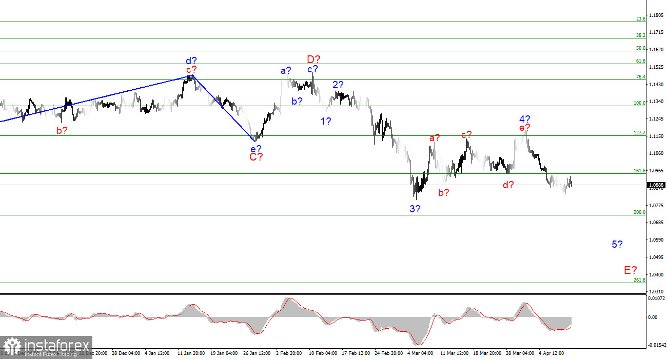 Исходя из проведенного анализа, я все еще делаю вывод, что продолжается построение волны E. Если так, то сейчас все еще хорошее время для продаж европейской валюты с целями, расположенными около отметки 1,0721, что соответствует 200,0% по Фибоначчи, по каждому сигналу MACD «вниз». Текущая волновая разметка предполагает построение волны 5 в E, которая также может получиться весьма протяженной. В ближайшие несколько дней может начать строиться коррекционная волна, после которой я ожидаю новое снижение инструмента.