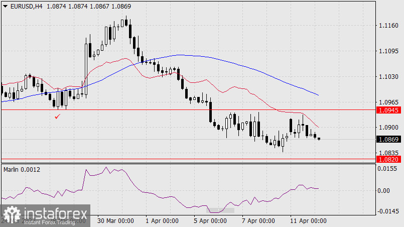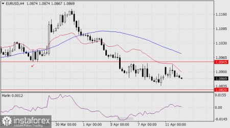Евро в понедельник немного не дотянулся до целевого уровня 1.0945, к которому тянулся во время коррекции, и развернулся вниз. Теперь у цены есть намерение уйти под поддержку 1.0820, чтобы иметь возможность развить полноценное наступление на целевой диапазон 1.0636/70. Впрочем, имеется одна небольшая деталь, которая даёт шанс к продолжению бокового движения цены в диапазоне 1.0820-1.0945 ещё на несколько суток – почти горизонтальное движение осциллятора Марлин.
