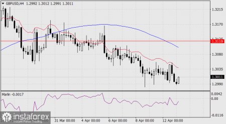 На четырёхчасовом графике осциллятор Марлин движется хаотически. Собственно цена снижается под индикаторной линией баланса по стандартной форме. У цены есть потенциал для продолжения нисходящего движения. Ждём отработку целевого уровня 1.2900.