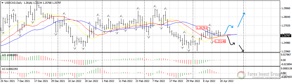 Технически на дневном таймфрейме мы наблюдаем сужение линий аллигатора, что свидетельствует о скором всплеске волатильности. Дальнейшее движение пары можно будет определить только после пробоя фракталов: либо верхнего фрактала у 1.2670, или нижнего у 1.2520.