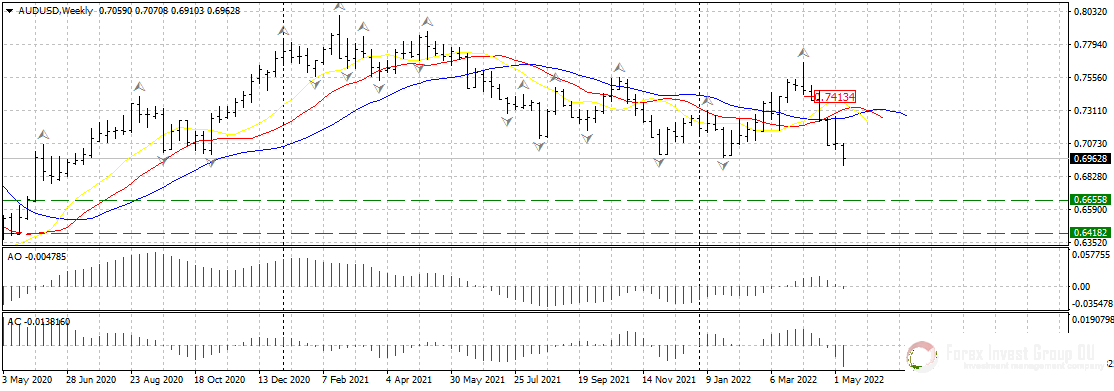 В начале мая РБА резко поднял базовую процентную ставку сразу на 25 базисных единиц. Это привело к мгновенному укреплению австралийской валюты, но все же уйти выше 72 фигуры и сломать сопротивление у линий аллигатора на недельном таймфрейме у покупателей “оззи” не получилось. Спустя несколько дней после заседания РБА пара потеряла больше 200 пп, а вчера прорвала значимую поддержку у 0.7000 и обновила январские минимумы текущего года у 0.6970. Если покупателям aud/usd не удастся переломить ситуацию и вернуться выше 0.7000, нисходящее движение возобновится с новой силой в направлении 0.6600-0.6300. Технически, по паре мы наблюдаем отработку разворотного сигнала на продажу от третьего апреля с точкой входа у 0.7420. Цена на всех старших таймфреймах ниже линий аллигатора, осцилляторы АО и АС красного цвета, что дополнительно свидетельствует в пользу продаж.
