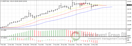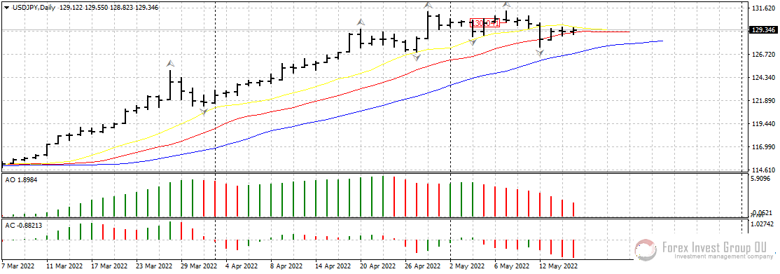 Коррекционный откат наблюдаем также и в паре доллар/иена. Разворотный бар на продажу от 130.00 был сформирован еще 9 мая. На данный момент нисходящий откат уперся в поддержку у линий аллигатора на дневном таймфрейме.