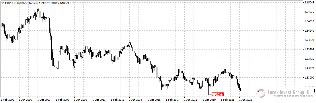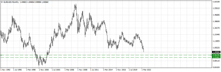 Единая европейская валюта всего за неделю потеряла около 400 пп, и на данный момент, как и ожидалось, тестирует важную психологическую отметку у 1.0000. Стоит отметить, что технически данный уровень не очень важен для пары. Скорее всего он будет пробит и цена продолжит падение в направлении экстремумов 2000 года у 0.9700-0.9500. Достижение паритета — больше психологический момент, ведь евро равен доллару, чего не наблюдалось больше 20 лет.