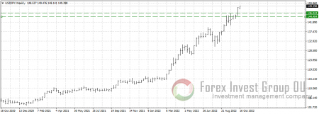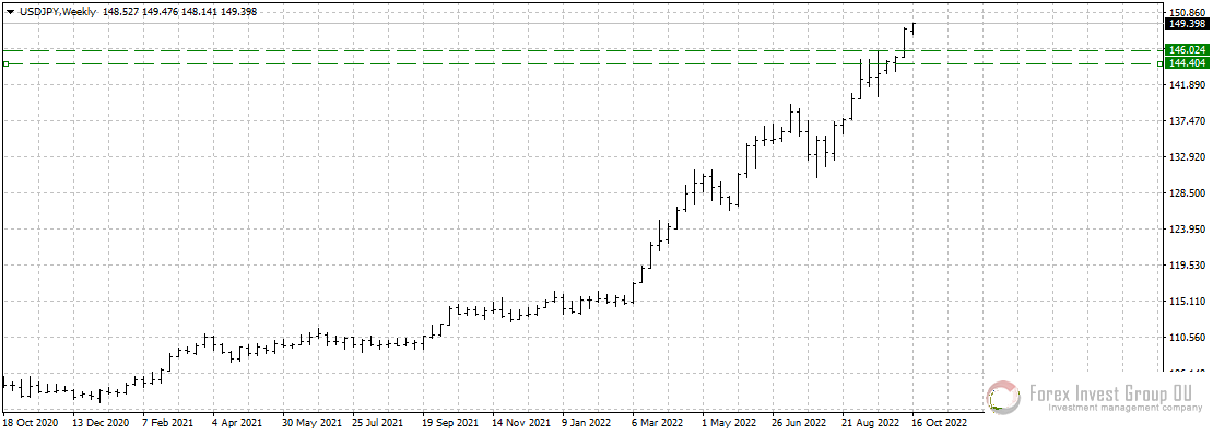 Причиной такого рекордного снижения японской валюты стала ультрамягкая монетарная политика Банка Японии и ястребиная тенденция среди большинства других крупных центробанков, в частности ФРС. Поэтому трудно сказать, где и когда остановятся покупатели usd/jpy. Скорее всего, либо после того, как Банк Японии решит изменить кредитно-денежную политику,либо ФРС перестанет повышать ставки. В случае начала коррекционного отката ближайшей областью, куда стоит ожидать снижения, станет диапазон 146.00-144.00.