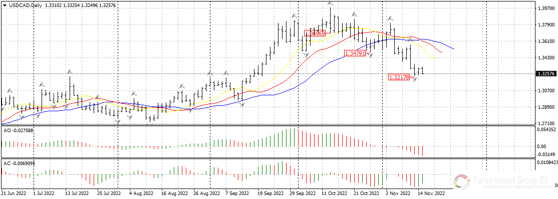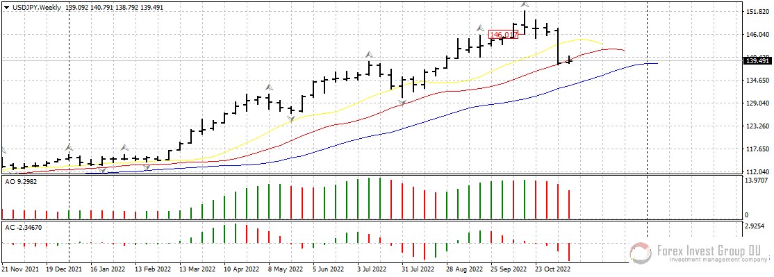 На недельном таймфрйме мы наблюдаем отработку разворотного бара от 16 октября. На данный момент цена готовится тестировать поддержку у нижней линии аллигатора на недельном таймфрейме. Если продавцы гринбек сломают поддержку у 134.00, можно будет готовиться к более полномасштабной нисходящей коррекции в направлении 130 фигуры. Из фундамента сегодня в 16.30 по МСК стоит обратить внимание на публикацию данных по индексу цен производителей (PPI) в США за октябрь.