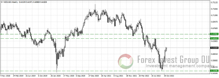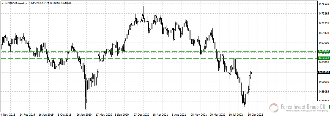 Снижение темпов инфляции в США и возможная пауза в ужесточении кредитно-денежной политики американским регулятором привели к молниеносному росту пары, и на данный момент цена находится выше психологической поддержки 0.6000. Если пара продолжит укрепляться, ближайшей целью для роста станет диапазон 0.6300-0.6200. Тем не менее, при входах в покупки следует учитывать тот факт, что пара в восходящем тренде находится уже более шести недель, в любой момент можно ожидать отката к 0.6000-0.5800.