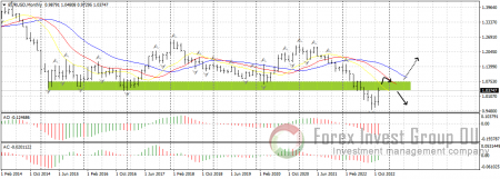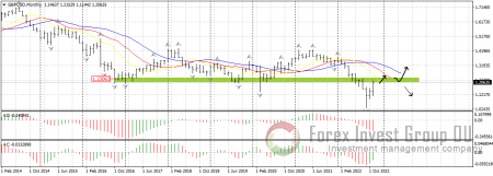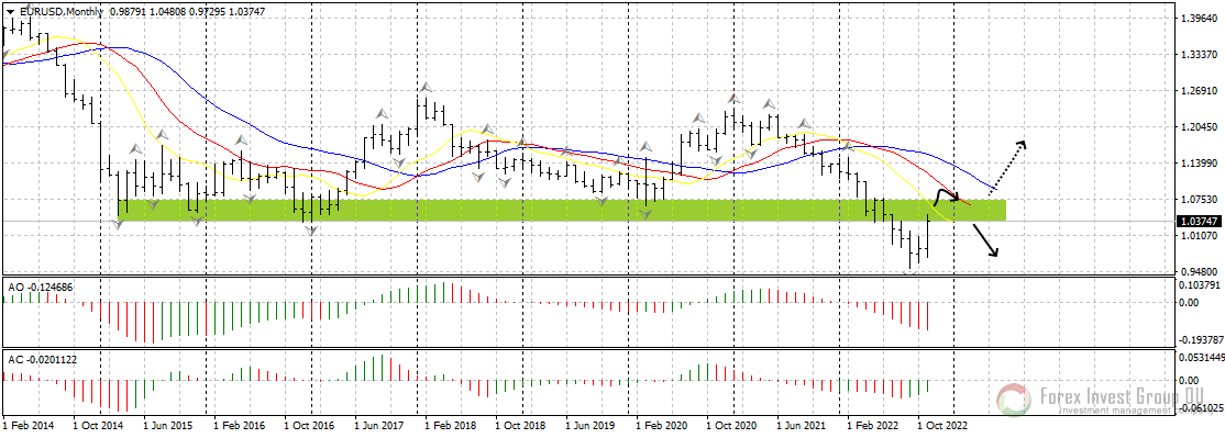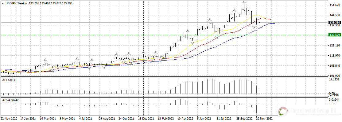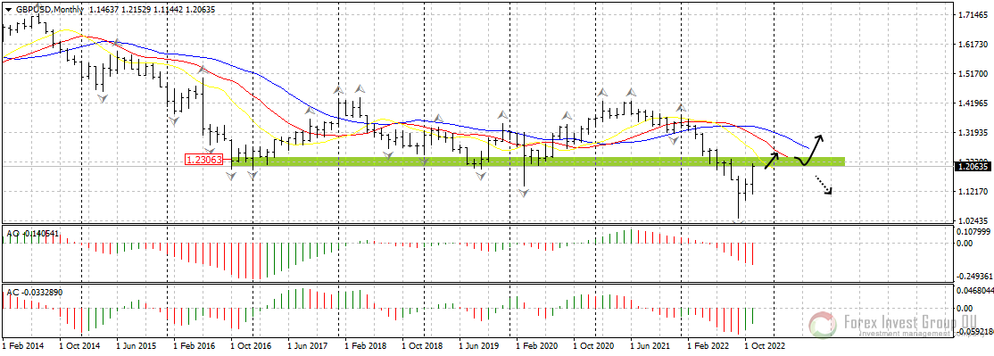 Пара gbp/usd после обвала на 1000 пп в сентябре, вызванного неудачными реформами правительства Лиз Трасс, сумела не только сформировать разворотные комбинации на старших таймфреймах, но и успешно их отработать, закрепившись при этом выше линий аллигатора на d1 и w1. Тем не менее, на данный момент покупатели приближаются к важному диапазону 1.2300-1.2200, который сдерживал натиск продавцов фунта с 2016 года. Вполне возможно, что отбой от упомянутых уровней может привести к еще одному нисходящему витку по паре. В то же время, если цена сумеет преодолеть данный диапазон, это будет свидетельствовать в пользу более масштабной и длительной восходящей коррекции в направлении 1.3000.