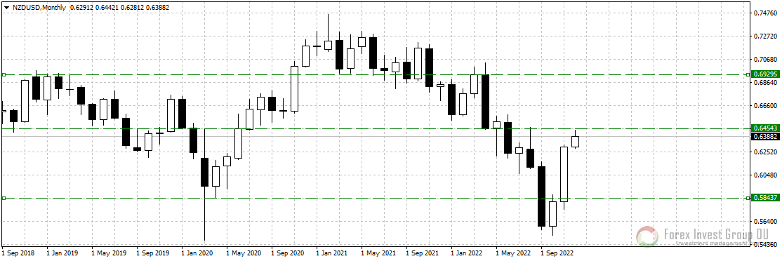 В валютной паре nzd/usd наблюдаем отработку разворотной комбинации на покупку "пронизывающая свеча", сформированную на месячном таймфрейме. После теста экстремумов 2020 года цена сумела укрепиться более чем на 500 пп. Увидим ли мы продолжение восходящего тренда зависит от входящего фундамента ближаших торговых сесий. Уход выше 0.6400 откроет дорогу к 0.7000. Отбой от текущих уроней позволит расчитывать на тест 0.6000-0.5800.
