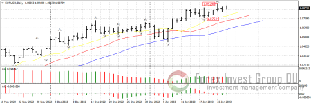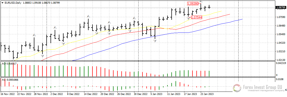 Единая европейская валюта пока сохраняет шансы на продолжение восходящего движения. Цена уверенно держится выше линий аллигатора на старших таймфреймах, периодически обновляя недавние максимумы. Сегодня в 21.00 по МСК ждем выступление члена Бундесбанка Бальца. Завтра в 16.30 по МСК выйдут данные по ВВП США за четвертый квартал. Также в это же время будет опубликован показатель базовых заказов на товары длительного пользования в США за декабрь прошлого года.