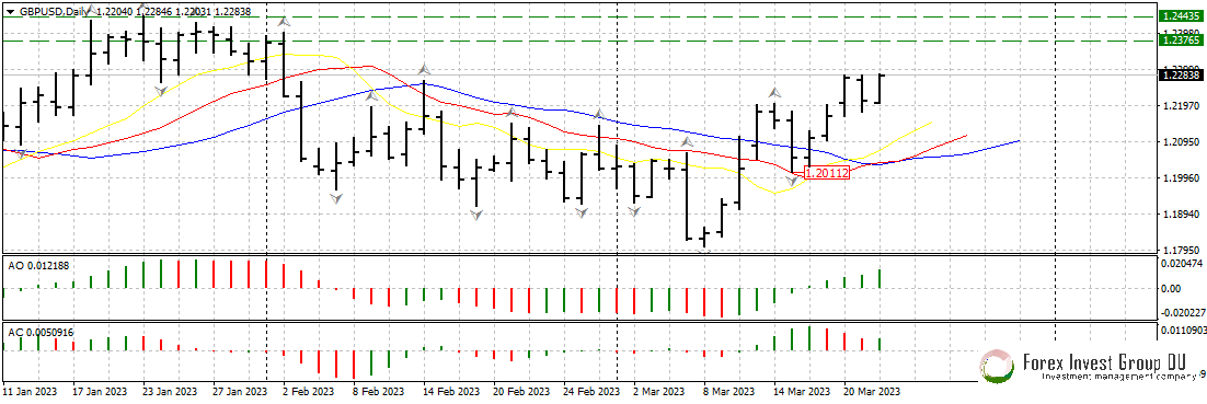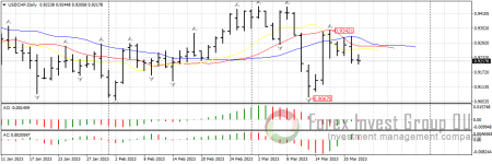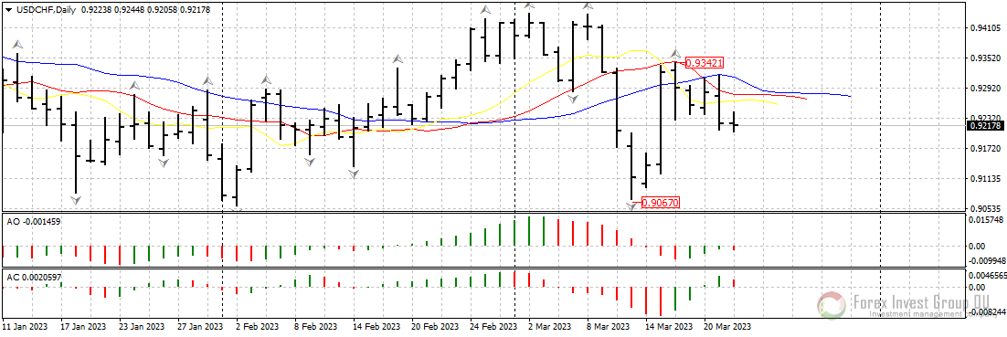 Швейцарский франк понемногу отходит от недавнего обвала, связанного с Credit Suisse. В ожидании завтрашнего заседания НБШ, на котором предположительно будет повышена базовая процентная ставка на 0,50%, пара укрепилась ниже линий аллигатора на дневном таймфрейме и готова к пробою нижнего фрактала у 0.9070. Стоит отметить, что пара usd/chf торгуется между 0.9400-0.9100 уже больше трех месяцев, пробой указанных границ может вызвать сильное импульное движение.