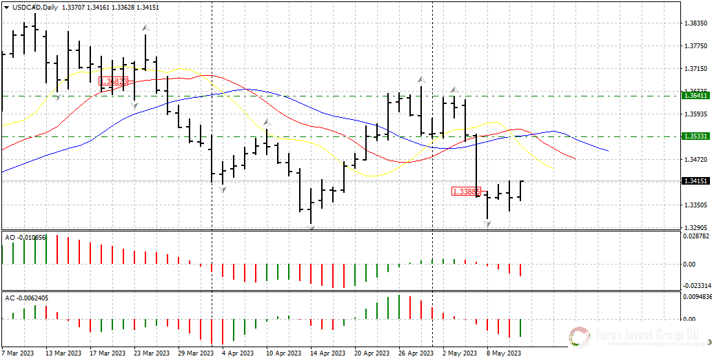 Продавцы гринбек так и не сумели справиться с поддержкой, расположенной чуть выше 1.3300, в паре usd/cad. Вчера после выхода данных по инфляции цена резко упала, но отскочила от 1.3330. Сегодня наблюдаем попытку покупателей укрепиться выше 1.3400 и начать отрабатывать разворотный бар на покупку от 8 мая с точкой входа у 1.3390. Если отработка сигнала окажется успешной, ближайшей областью для восходящей коррекции станет диапазон 1.3600-1.3500.