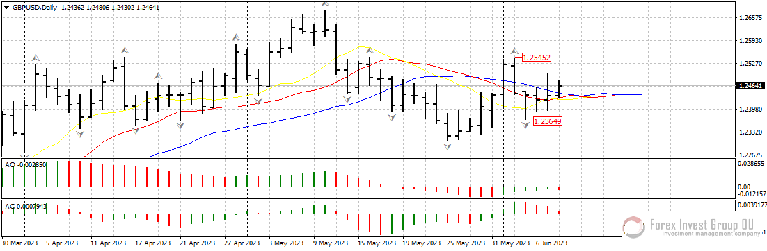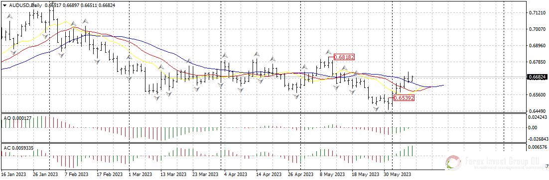 Покупатели “оззи” после провала пары ниже 0.6500 сумели собраться и укрепили цену более чем на 200 пп. На дневном таймфрейме наблюдаем отработку разворотного бара от 31 мая с точкой входа у 0.6540. На данный момент цена торгуется выше линий аллигатора. Если покупатели удержат диапазон 0.6640-06600 в качестве поддержки, ждем продолжения роста в направлении 0.7200-0.7000.