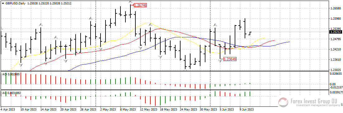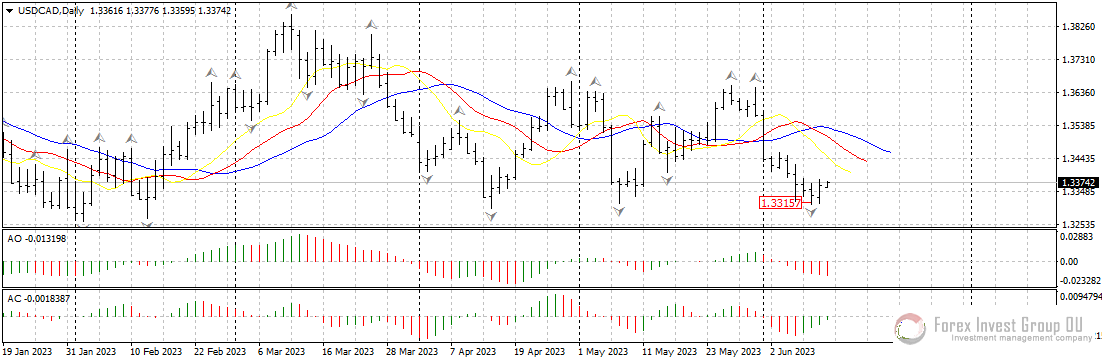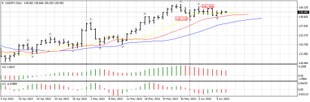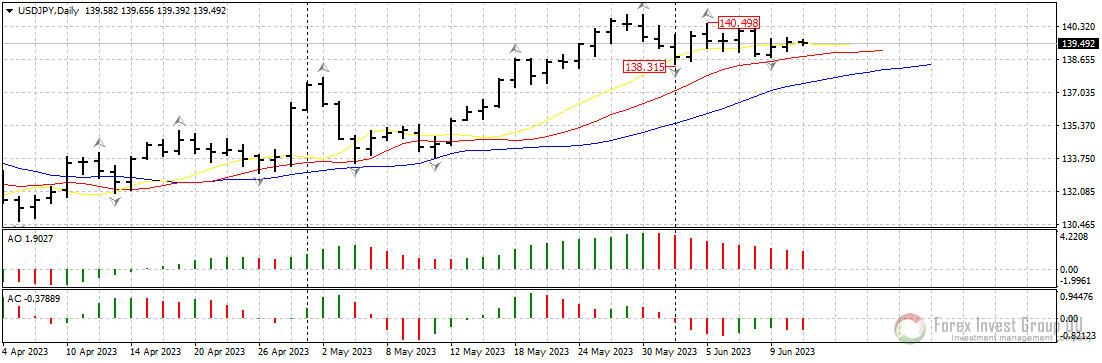 Валютная пара usd/jpy уверенно держится выше линий аллигатора на дневном таймфрейме, но, как видим, возобновить восходящий тренд и уйти выше 140.00 покупателям гринбек сил не хватает. Вполне возможно, что участники рынка ожидают завтрашнего решения ФРС по ставке и сегодняшних данных по индексу потребительских в США для новых входов по паре. По прогнозам аналитиков инфляция за май должна снизиться с 0,4% к 0,2%. Ставку ожидают на прежнем уровне - 5,25%. Если данные выйдут согласно прогноза, это может оказать медвежье давление на пару, usd/jpy может пробить поддержку у 139 фигуры и возобновить нисходящий тренд. В случае если ФРС по примеру РБНЗ и РБА в очередной раз поднимет ставку, стоит готовиться к пробою верхнего фрактала у 140.50.