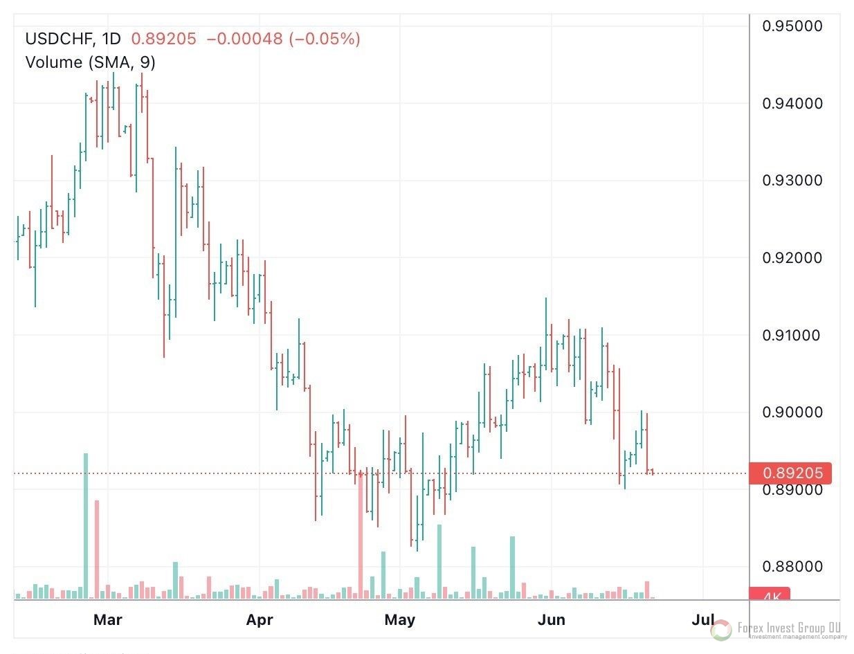 Валютная пара доллар/франк после резкого обвала в начале весны сумела вернуться выше значимого уровня 0.9000. «Ястребиная пауза ФРС» привела к возобновлению нисходящего движения и на данный момент пара близка к повторному тесту минимума текущего года у 0.8820. Швейцарский регулятор один из немногих, кто за последние два года не стал экстремально повышать ставку. Базовая процентная ставка по chf даже после поднятия будет очень низкой по сравнению с другими валютами - 1,75%. Поэтому, если НБШ объявит об ястребином курсе кредитно-денежной политики, пара доллар/франк может взять курс на длительное снижение в направлении 0.8500.