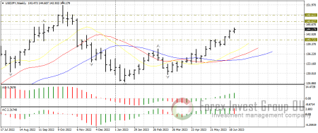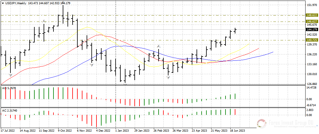 Как и предполагалось, доллар/иена продолжает экспоненциальный рост в направлении экстремумов 2022 года у 148.00-146.00. Ряд позитивной макроэкономической статистики, опубликованный на этой неделе, и готовность ФРС еще несколько раз повысить базовую процентную ставку в текущем году оказывают мощную поддержку американской валюте и вполне могут привести к росту пары к 150 фигуре.