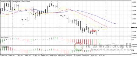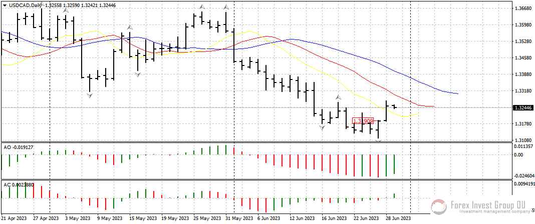 В паре доллар/канадец наблюдаем начало отработки разворотного бара на покупку от 27 июня с точкой входа у 1.3190. Цена приближается к сопротивлению у линий аллигатора на дневном таймфрейме, осцилляторы АО и АС зеленого цвета, что дополнительно свидетельствует в пользу роста. Отменой восходящему сценарию станет уход ниже 1.3100.