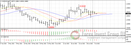 Британская валюта, после резкого укрепления в конце прошлой недели, перешла к диапазонной торговле между 1.2740 и 1.2680. Тем не менее, пока цена находится выше линий аллигатора на дневном таймфрейме, шансы на возобновление роста с последующим тестом 1.2840 очень высоки. Отменой восходящему сценарию станет пробой нижнего фрактала у 1.2590. Сегодня выходит ряд важных данных из Великобритании. Это индекс деловой активности в секторе услуг и композитный индекс PMI. Аналитики прогнозируют снижение данных показателей, что может негативно повлиять на gbp/usd.