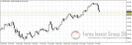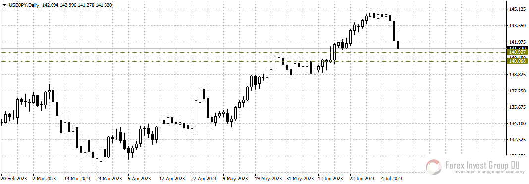 Доллар/иена отрабатывает комбинацию «темные облака» на дневном таймфрейме, сформированную 30 июня. В пятницу цена протестировала важный уровень 142.00, затем резко отскочила, а вчера нисходящее движение в направлении 141.00-140.00 продолжилось с новой силой.