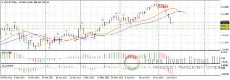 Разворотный бар на продажу от 30 июня по торговой системе “хаос” отработал на 200%. Всего за две недели цена снизилась на 600 пп, пробив при этом поддержку у линий аллигатора на дневном таймфрейме. Осцилляторы АО и АС красного цвета, что свидетельствует о силе продавцов и продолжении нисходящего импульса как минимум к 137.00-136.00. Хотя следует учитывать, что после таких безоткатных движений бывают резкие импульсы в противоположном направлении.