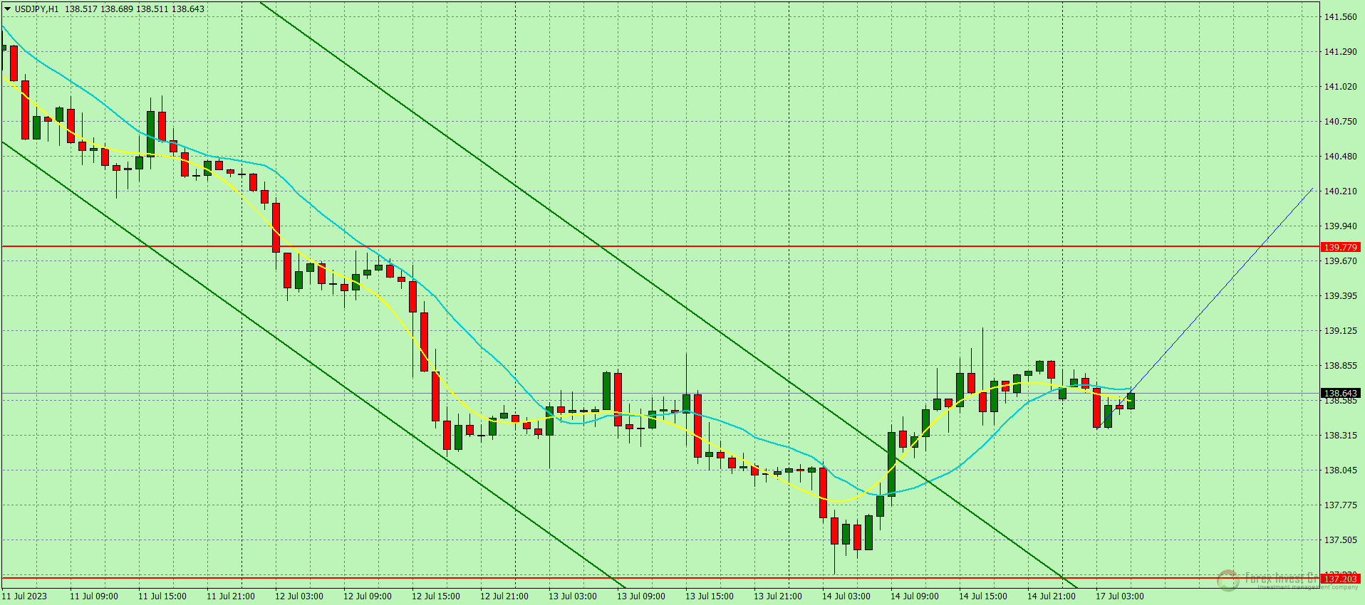 Цена пробила верхнюю границу нисходящего канала и может продолжить рост к уровням около 140.00 иен за доллар.