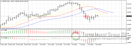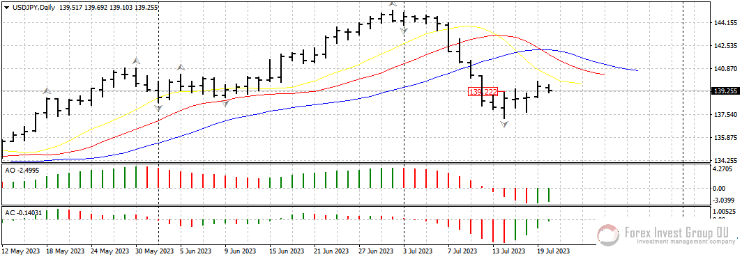 В паре доллар/иена мы наконец наблюдаем отработку разворотного бара на покупку от 14 июля с точкой входа у 139.20. Вчера цена почти дотянулась к сопротивлению у линий аллигатора на дневном, но уйти выше 140.00 пока не удалось. Отменой восходящего сценария по паре станет пробой минимума сигнального бара у 137.00.