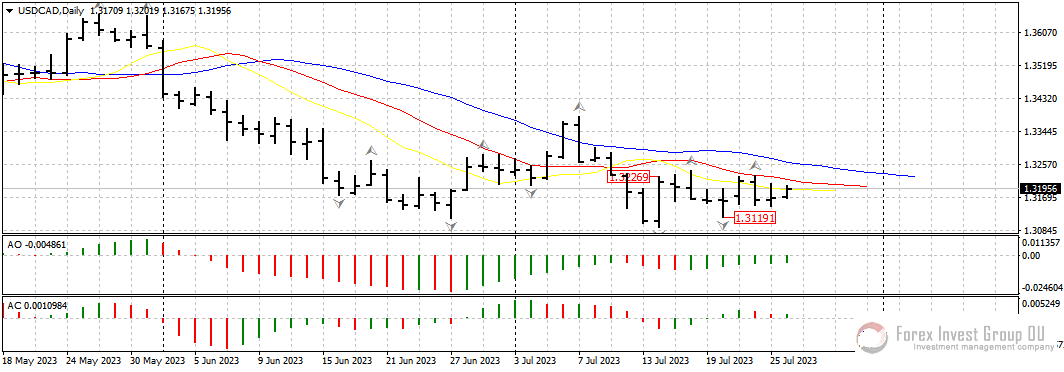 Валютная пара usd/cad продолжает торговаться между 1.3200-1.3100. На дневном таймфрейме сформирован разворотный бар на покупку от 14 июля с точкой входа у 1.3230. Но пока цена даже не подходит к месту входа, и пара все также торгуется ниже линий аллигатора на дневном таймфрейме. Если завтра федрезерв поднимет базовую ставку, как прогнозируют эксперты, на 25 базисных единиц и объявит еще об одном повышении в текущем году, пара usd/cad может мгновенно оказаться у 1.3500-1.3400. В противном случае можно готовиться к пробою нижнего фрактала у 1.3100. Помимо заседания ФРС сегодня в 17.00 по МСК стоит обратить внимание на публикацию данных по числу выданных разрешений на строительство в США за июнь. Также в 17.30 по МСК выйдут еженедельные показатели по запасам сырой нефти в США.