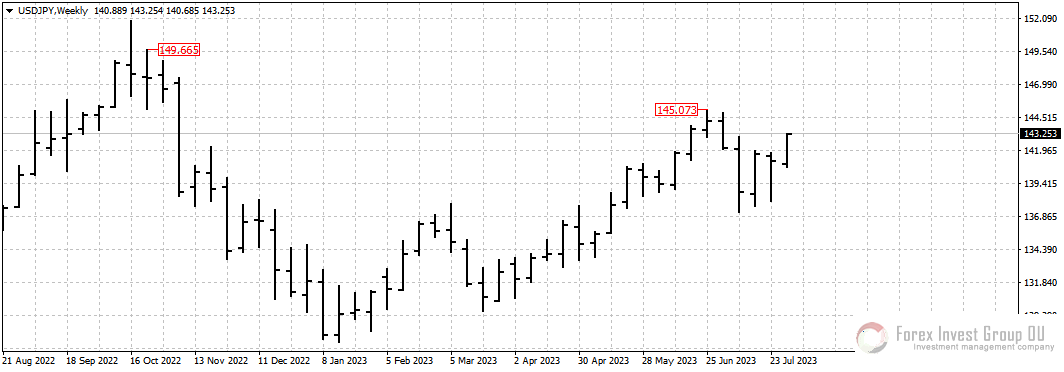 Повторный тест важной поддержки у 138.00, который мы наблюдали на прошлой неделе, и неизменно “голубиная риторика” Банка Японии активировали долларовых быков, и на данный момент цена готовится тестировать недавние экстремумы у 145.00-144.00. Если данные уровни перейдут в статус поддержки в течение нескольких торговых недель, цена может оказаться у 150 фигуры.