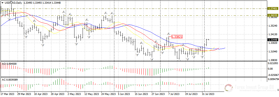 Как и ожидалось в начале недели, уход выше линий аллигатора пары usd/cad способствовал росту в направлении верхнего фрактала у 1.3380. Если диапазон 1.3400-1.3380 перейдет в статус поддержки, ждем теста важных уровней у 1.3740-1.3650. Из фундамента сегодня в 15.30 по МСК ждем публикацию еженедельных показателей по количеству обращений за пособиями по безработице в США. Также в 17.00 по МСК выйдет индекс менеджеров по снабжению для непроизводственной сферы США от ISM за июль. И естественно, определяющими дальнейший тренд для долларовых пар станут завтрашние данные по количеству занятых вне сельскохозяйственного сектора. Аналитики прогнозируют около 200К новых рабочих мест в июле. Если данные окажутся гораздо лучше прогноза, пара доллар/канадец может мгновенно оказаться у 1.3500. Если же инвесторы будут разочарованы Non Farm Payrolls, мы увидим формирование разворотных комбинаций на продажу от ключевых сопротивлений.