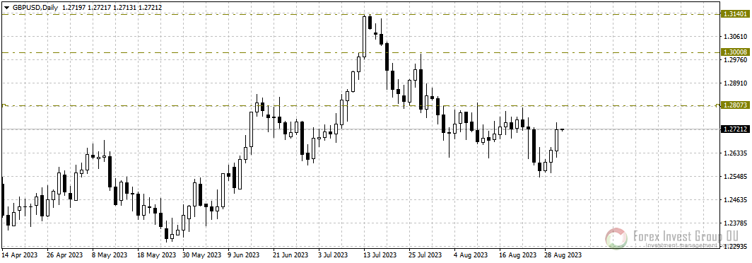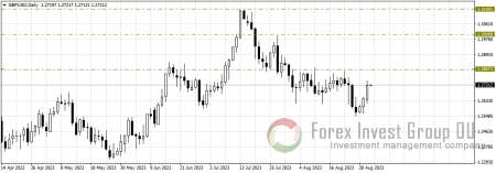 В паре фунт/доллар наблюдаем отработку разворотной комбинации на покупку “бычье поглощение” от 28 августа. Покупатели пары справились с первым серьезным сопротивлением у 1.2720-1.2680, если цена удержится выше данных отметок, можно будет готовиться к продолжению роста к 1.3100-1.3000. Отмену сценария восходящей коррекции рассматриваем только после закрития дневном свечи ниже 1.2600.
