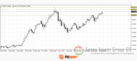 В паре доллар/иена можно наблюдать резкий импульсный рост. Важный диапазон 147.00-146.00 уже в статусе поддержки, если текущая ситуация не изменится в течение пары недель. ждем теста прошлогоднего максимума у 151 фигуры.