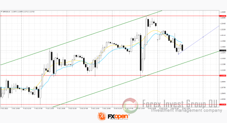 По максимумам двух дней сформировался новый восходящий канал. Сейчас цена отошла от верхней границы канала и может продолжить движение к нижней границе.
