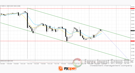 По минимумам двух дней сформировался новый нисходящий канал. Сейчас цена находится около верхней границы канала, откуда может продолжить снижение.
