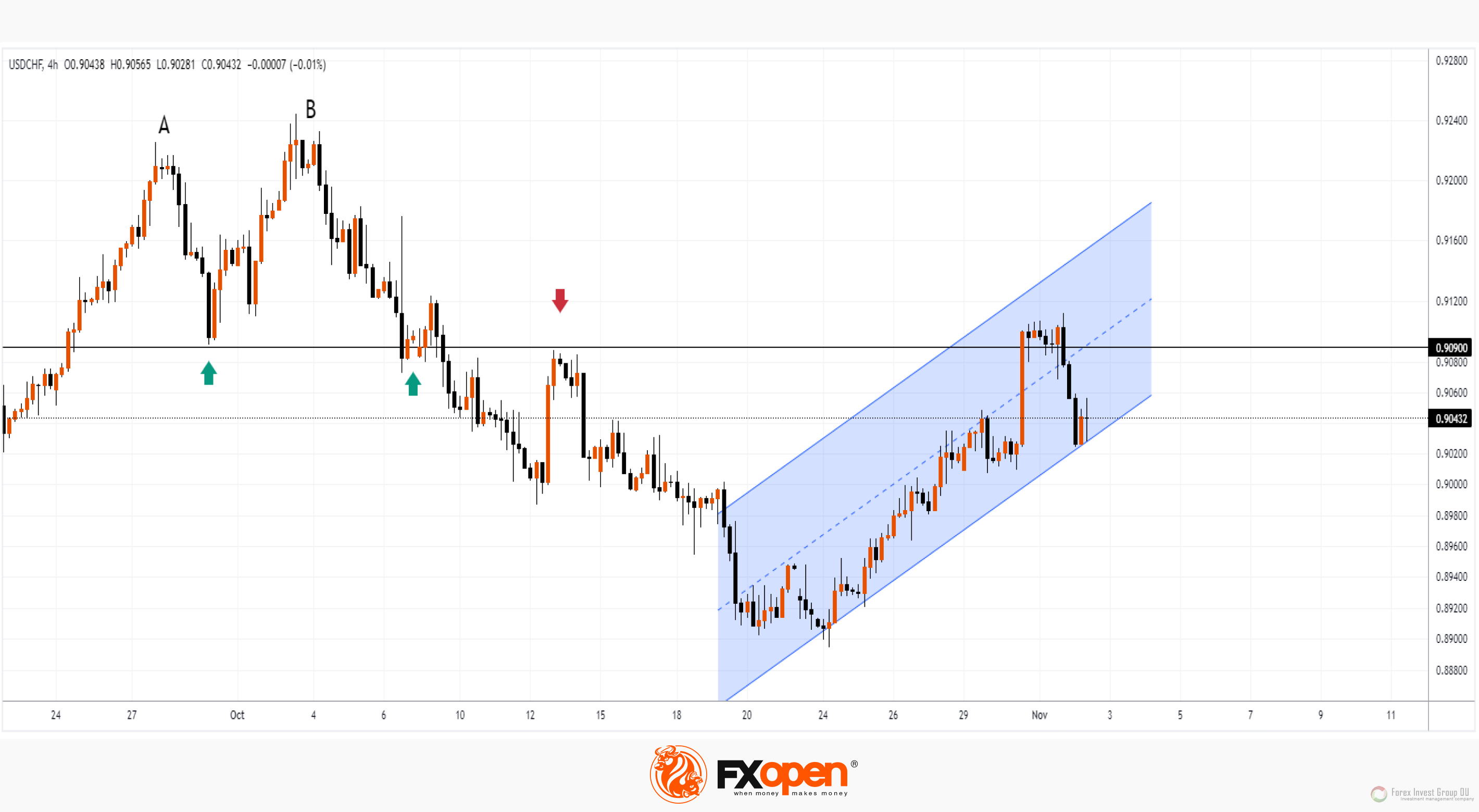 5 октября мы писали, что швейцарский франк находится вблизи важного сопротивления, формируя двойную вершину А-В. После этого курс опустился на 2,5% сформировав минимум октября, и теперь график дает новую порцию информации для анализа, в частности – об уровне 0,909, который действует как важное сопротивление.