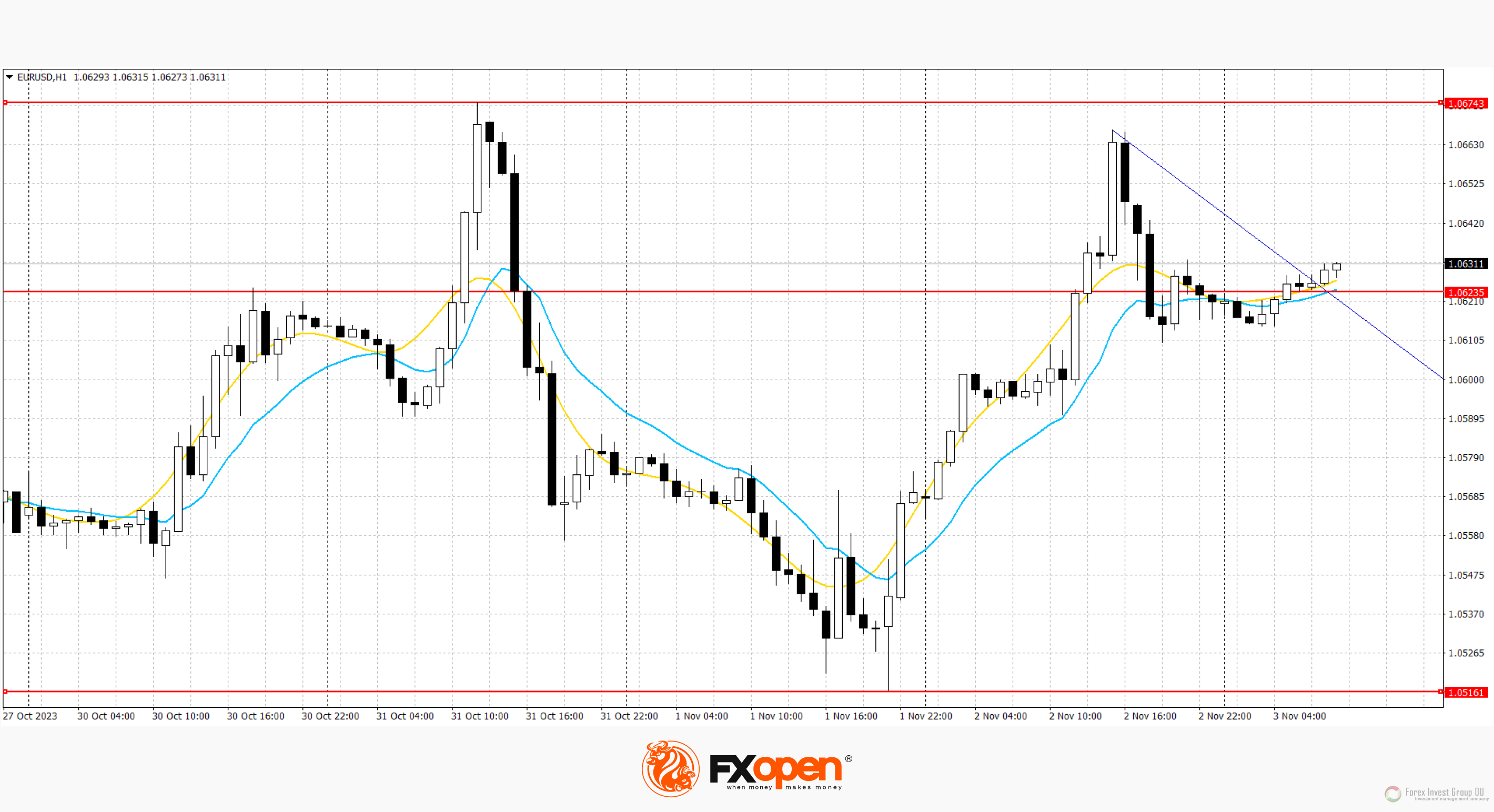 FxSignal 3-11-2023, 13:00 481 Аналитика, прогнозы валютного рынкаСегодняшняя динамика рынка объясняется ожиданиями сегодняшней публикации финального отчёта по рынку труда США за октябрь, который может задать тон торгов начала следующей недели. Прогнозы предполагают замедление динамики новых рабочих мест вне сельскохозяйственного сектора с 336,0 тыс до 180,0 тыс, безработица, вероятно, сохранится на отметке 3,8%, а средняя почасовая заработная плата — снизится с 4,2% до 4,0%. В среду, 1 ноября, регулятор принял решение сохранить стоимость заимствований без изменений, а его глава Джером Пауэлл, в свою очередь, отметил, что не исключает возможного повышения процентной ставки в будущем, однако рынки лишь убедились в том, что пик значения пройден. Более того, некоторые аналитики пересматривают прогнозы в отношении сроков начала смягчения монетарных условий. Так, теперь котировки по федеральным фондам оценивают вероятность повышения показателя в марте 2024 года примерно в 15,0% при не более 10,0% ранее. Теперь чиновники, вероятно, будут лишь удерживать показатель на ограничительном уровне в течение долгого времени, анализируя поступающую макроэкономическую статистику.