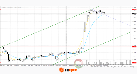 По максимумам прошлой и нынешней недели сформировался новый восходящий канал. Сейчас цена отошла от верхней границы канала и может продолжить снижение.
