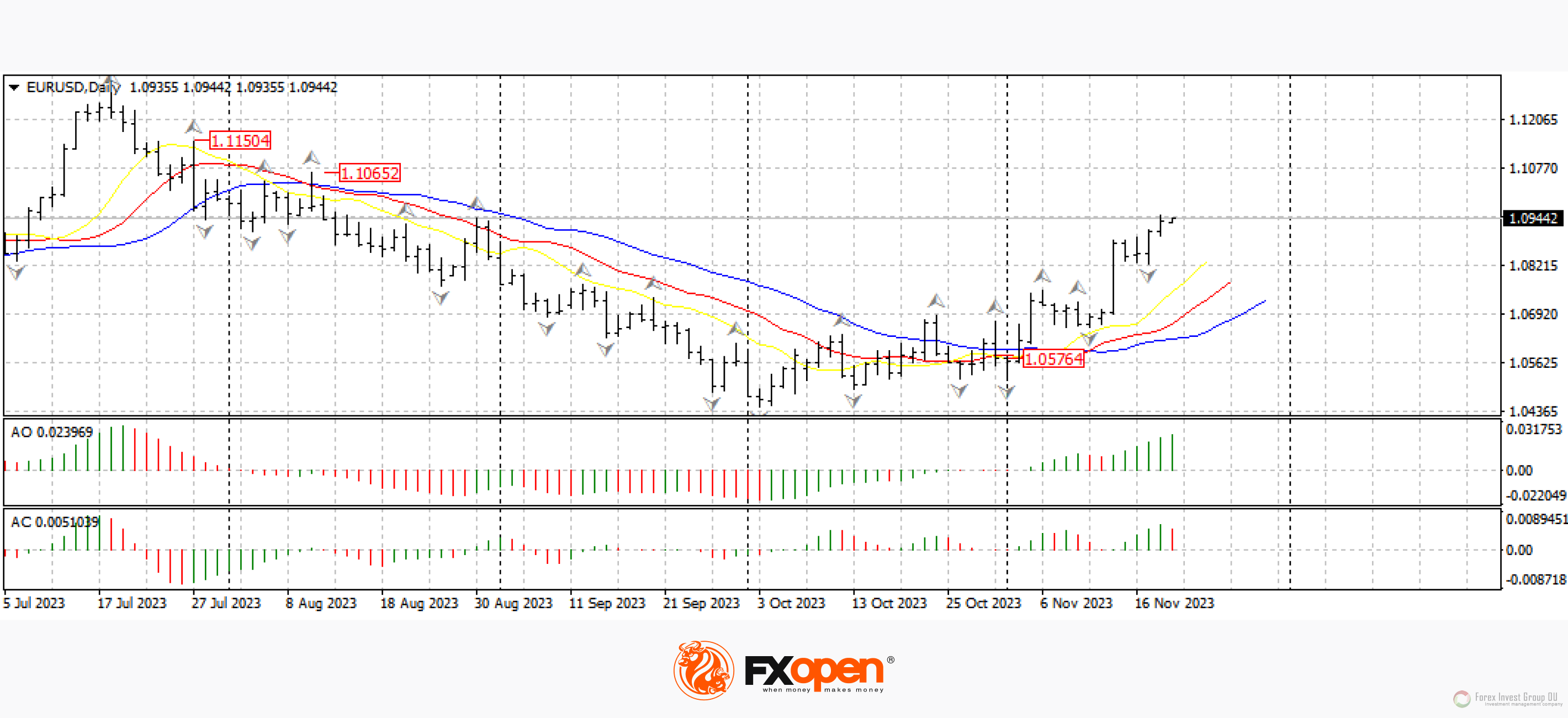 FxSignal 21-11-2023, 13:01 418 Аналитика, прогнозы валютного рынкаСлабые данные по рынку труда в США, опубликованные в начале ноября, и падение инфляции, зафиксированное на прошлой неделе, способствовали укреплению веры инвесторов в то, что ФРС начнет снижать ставки уже в первом квартале следующего года. В итоге таких настроений на рынке доллар упал практически ко всем валютным парам. Так, валютная пара евро/доллар готовится тестировать психологическое сопротивление у 1.1000, пара фунт/доллар повторно тестирует 1.2500, а пара доллар/иена упала ниже 149 фигуры.