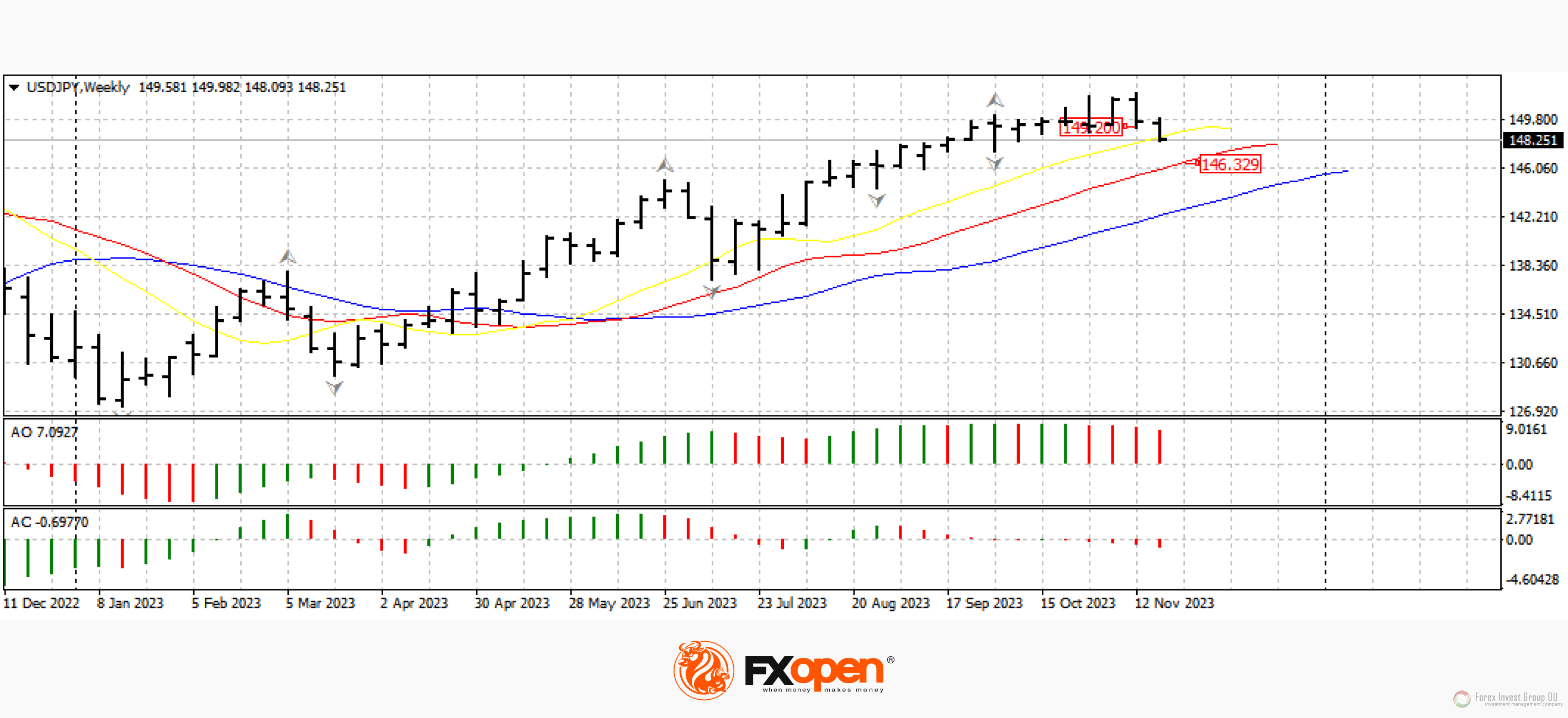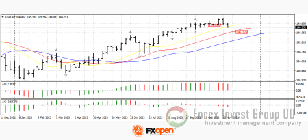 Резкий откат от 151.90 в паре доллар/иена способствовал формированию разворотного бара на продажу на недельном таймфрейме с точкой входа у 149.20. На данный момент цена торгуется вблизи поддержки у линий аллигатора у 148 фигуры.
