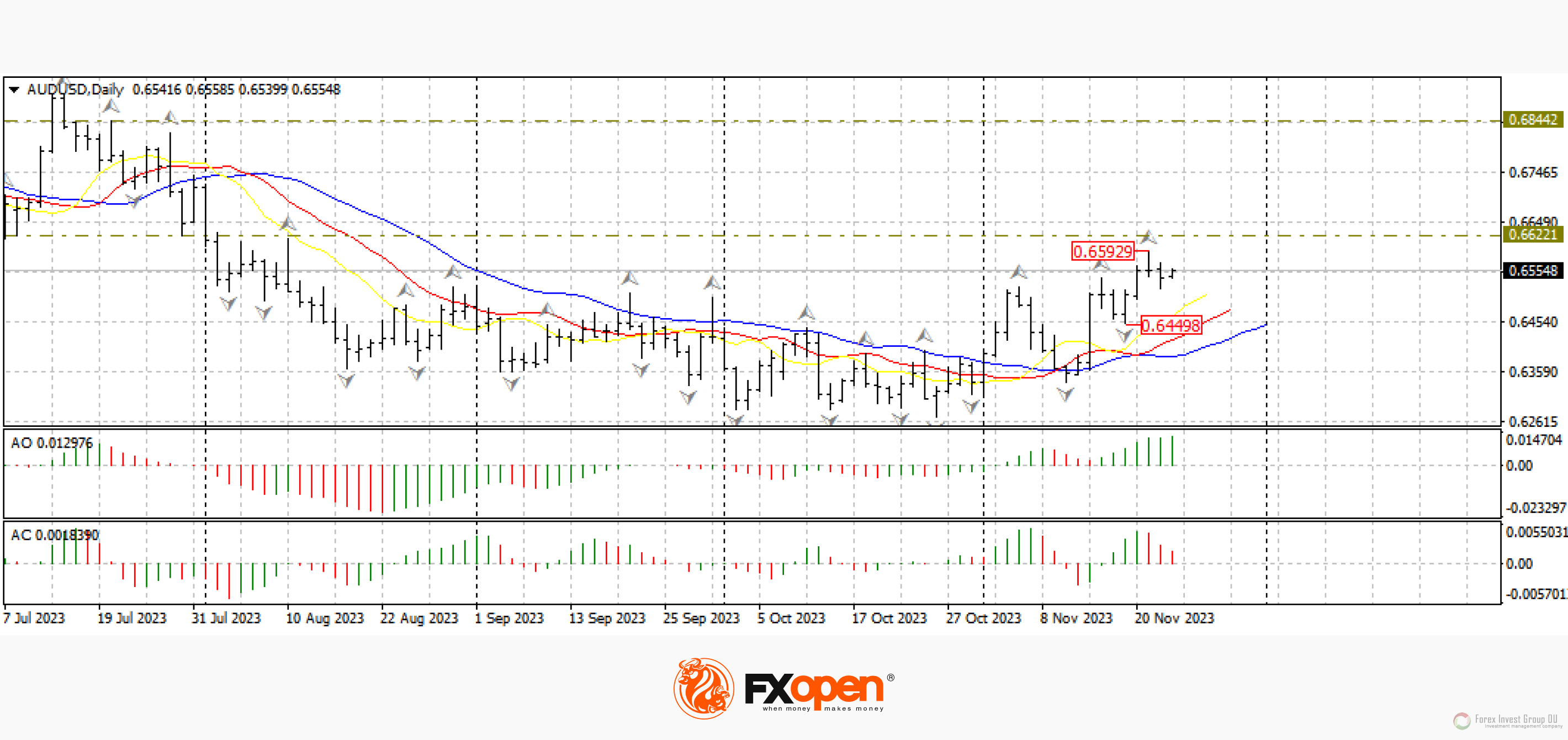 FxSignal 23-11-2023, 14:01 423 Аналитика, прогнозы валютного рынкаПосле публикации протоколов ФОМС во вторник доллар сумел частично вернуть утраченные позиции. Так в паре доллар/иена можно было наблюдать коррекционный откат к 149 фигуре, пара доллар/канадец почти протестировала 1.3800, а пара aud/usd тестировала важный уровень 0.6500, но уже в качестве поддержки. Отступили от ранее достигнутых максимумов и европейские валюты. Тем не менее, развить полноценное восходящее движение покупателям доллара пока не удалось и уже вчера вечером во многих парах продолжились основные тренды, основанные в начале ноября.