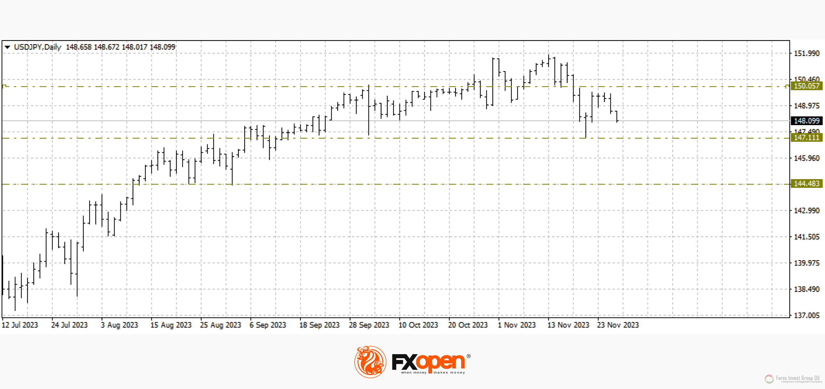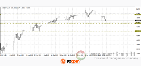 Охлаждение рынка труда в США и снижение инфляции способствуют усилению медвежьих настроений по доллару. Все больше участников рынка испытывают уверенность в том, что самый агрессивный цикл ужесточения ставок за последние пару десятков лет позади, и ФРС может снизить базовую процентную ставку уже в первом квартале 2024 года. Банк Японии наоборот длительное время придерживается политики ультранизких процентных ставок, и если решит изменить текущий вектор монетарной политики, пара доллар/иена может понести значительные потери.