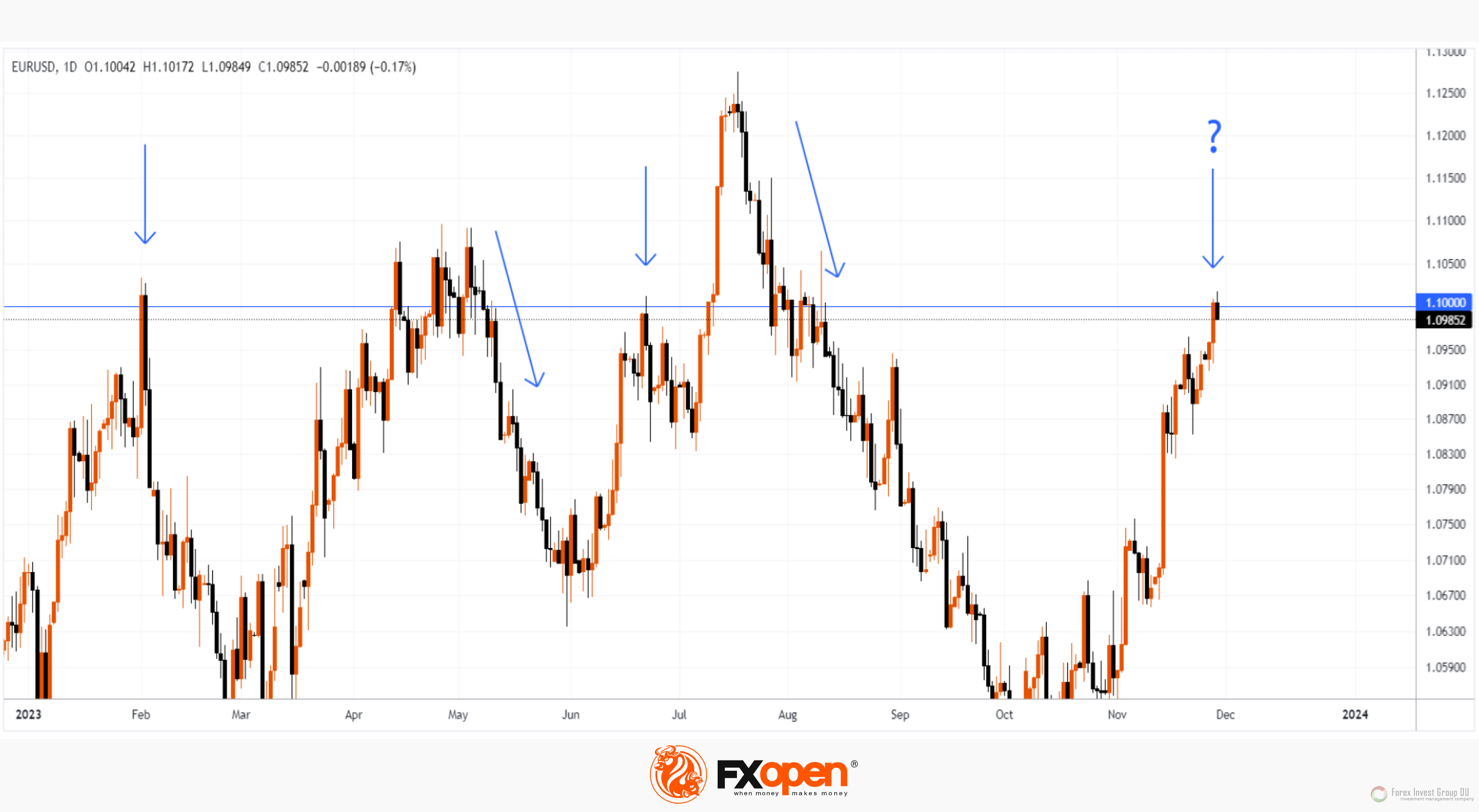 График показывает, что в 2023 году цена EUR/USD неоднократно взаимодействовала с ним, что вызывало, в том числе, развороты трендов. Как показывают стрелки: