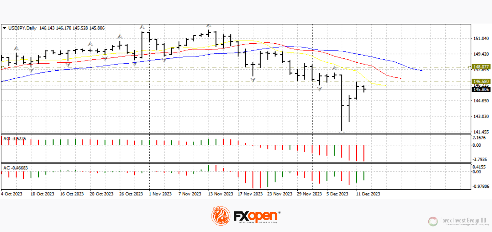Японская валюта резко выросла на прошлой неделе, так как появилась информация о том, что Банк Японии возможно в скором времени завершит политику ультранизких ставок и перейдет к ужесточению кредитно-денежной политики. Инвесторы выходили из длинных позиций по паре доллар/иена, в результате чего цена протестировала важный диапазон 142.00-141.00. В пятницу был опубликован последний в этом году отчет по занятости в США, продемонстрировавший рост средней заработной платы и увеличение новых рабочих мест. Показатели выше прогноза способствовали коррекционному росту пары к 146.00. Будет ли полноценное возобновление восходящего движения по паре, скорее всего, станет ясно уже в ближайшие торговые сессии.