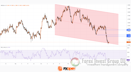 Учитывая перечисленные аргументы, стоит предположить сценарий отскока от нижней границы канала. Например, не исключено, что цена протестирует область 1.346-1.348, либо бывшую поддержку 1.355, сопротивление от которой может усилить медианная линия канала.