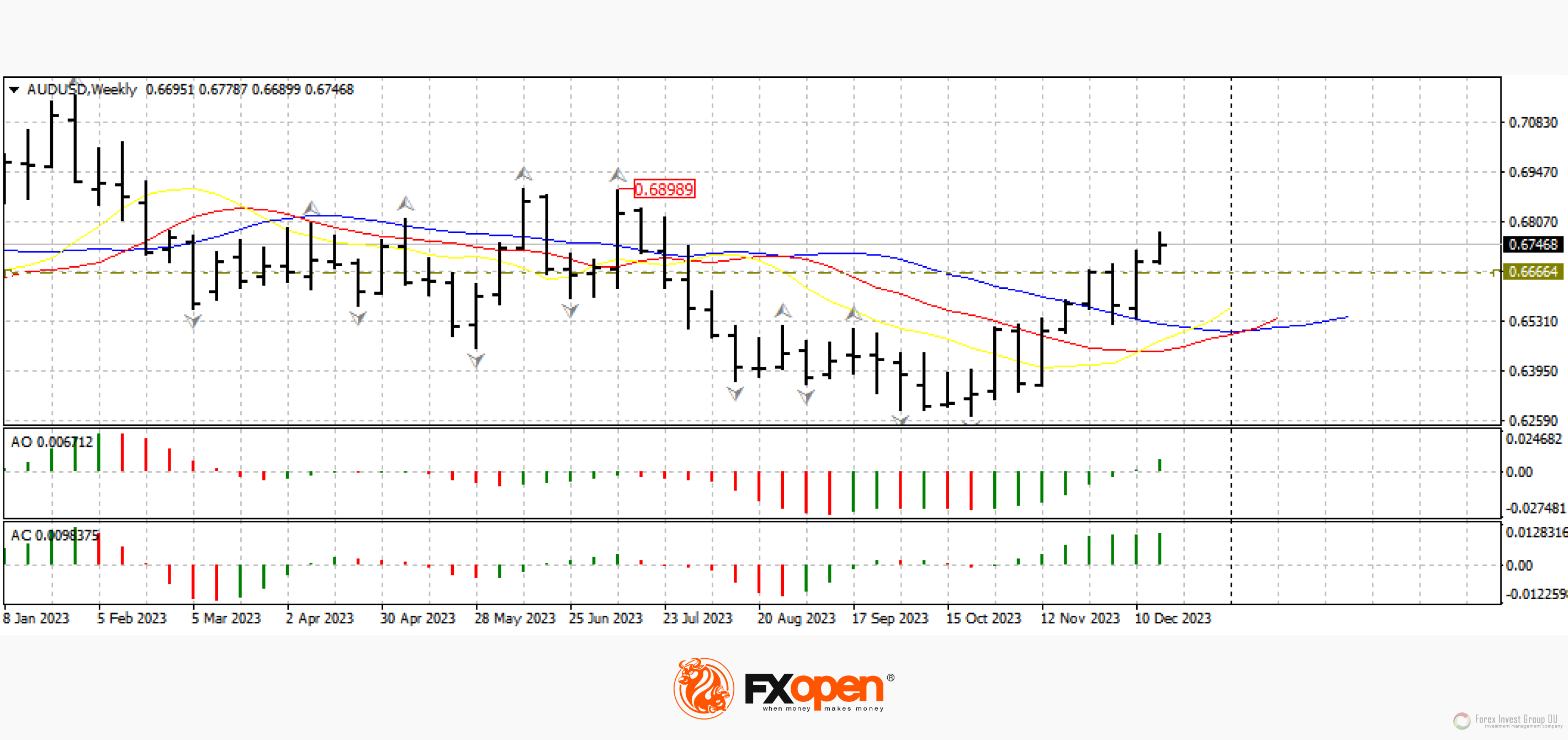 На недельном таймфрейме цена выше линий аллигатора, осцилляторы АО и АС зеленого цвета, что может способствовать усилению восходящего движения в направлении 0.6900-0.6800.