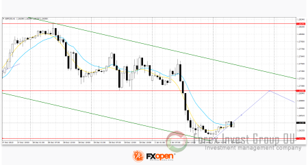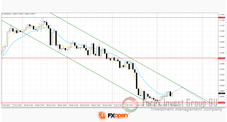 По минимумам двух дней сформировался новый нисходящий канал. Сейчас цена находится посредине канала и может продолжить снижение после приближения к верхней границе.