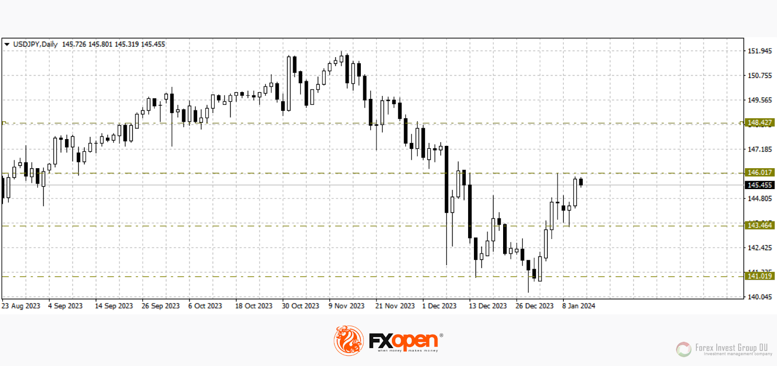 FxSignal 11-01-2024, 14:00 406 Аналитика, прогнозы валютного рынкаБлиже к концу текущей торговой пятидневки в большинстве валютных пар наблюдаем продолжение вялотекущего флетового движения. Так, пара фунт/доллар торгуется вблизи максимумов прошлой недели у 1.2770, пара евро/доллар пытается приблизиться к психологическому уровню 1.1000, в узких флетовых коридарах оказались зажаты и сырьевые валюты. А вот в паре доллар/иена немного другая картина. После нисходящего отката в прошлую пятницу, покупатели пары нашли поддержку у 143.40 и всего за один день укрепили цену больше чем на 100 пп. Удастся ли сохранить восходящий настрой по паре увидим сегодня после публикации данных по инфляции в США.