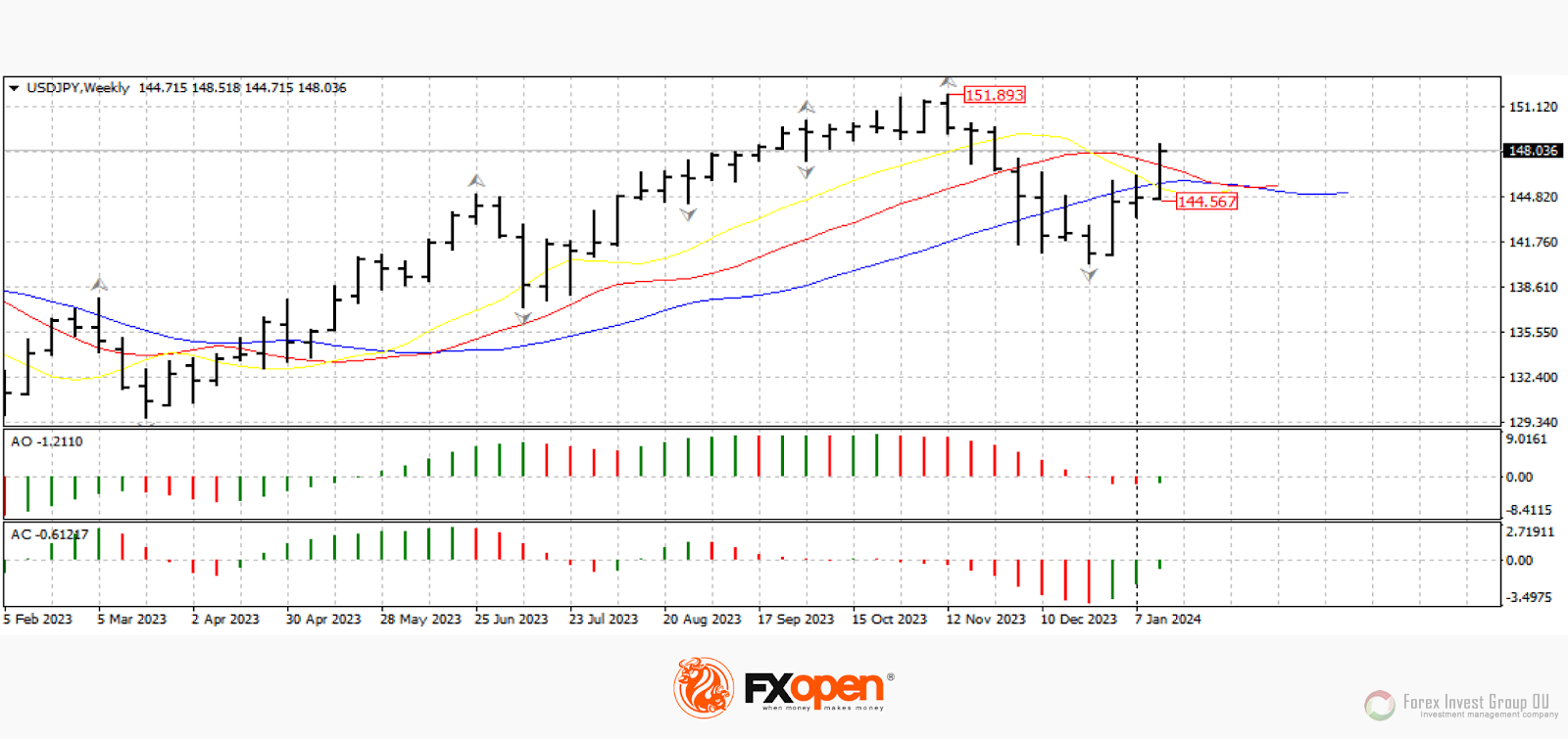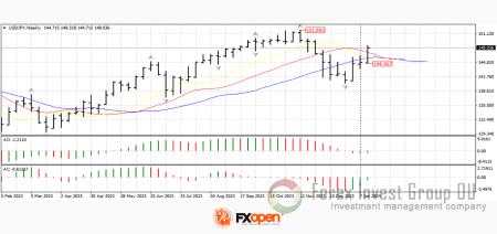 Серия позитивных макроэкономических данных из-за океана способствовала тому, что пара usd/jpy укрепилась больше чем на 500 пп всего за две недели. Разнонаправленные векторы кредитно-денежной политики Банка Японии и ФРС привели к повторному ослаблению японской валюты. Если существующая ситуация на рынке не изменится в ближайшие торговые сессии, на следующей неделе цена может протестировать ноябрьские экстремумы 2023 года у 151.90-150.00.