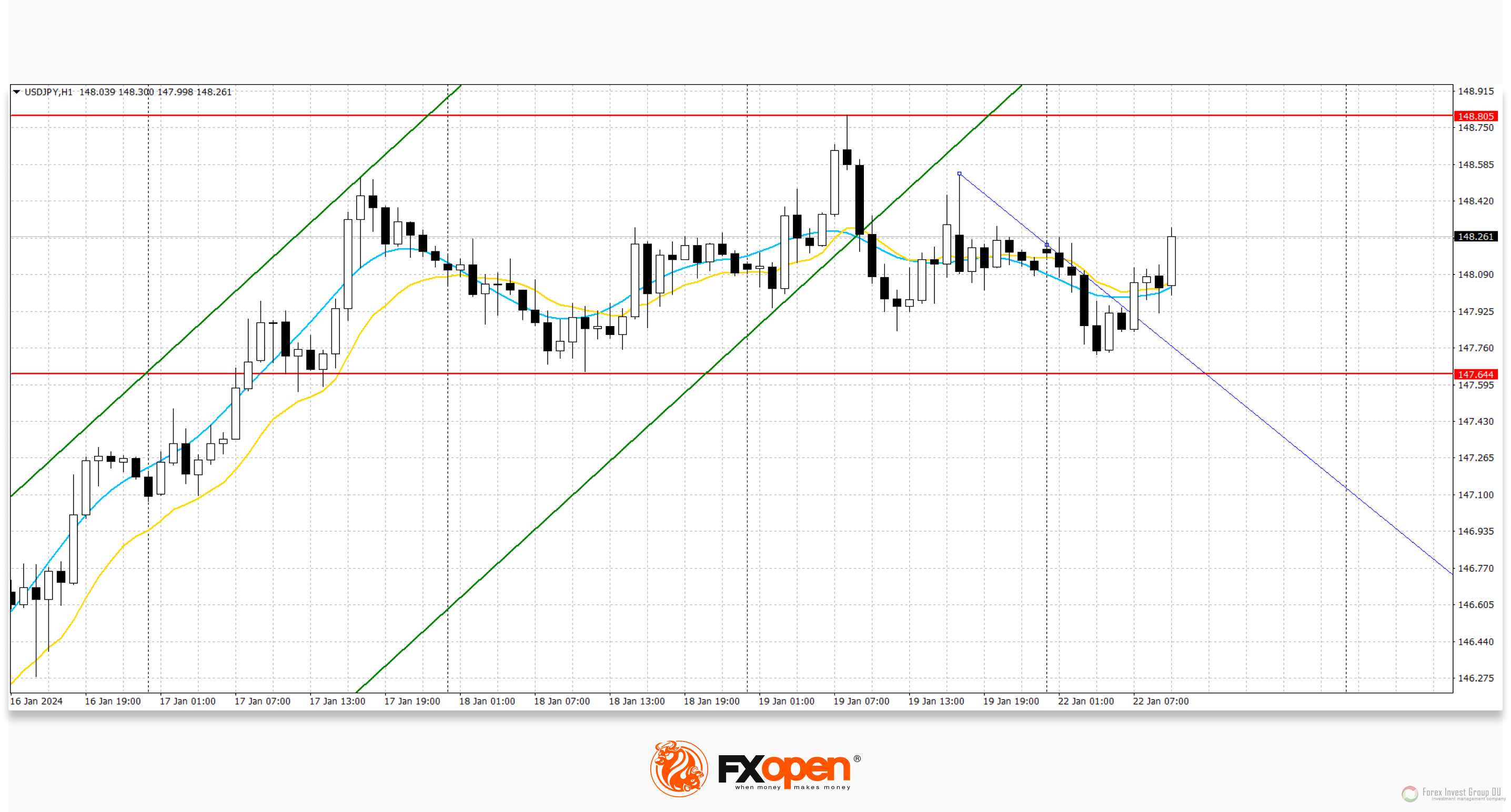 Пара USD/JPY корректируется вниз на фоне отсутствия ключевой макроэкономической статистики. Сильное сопротивление можно увидеть на отметке 148,80, прорыв вверх может спровоцировать рост к 149,60. С другой стороны, ближайшая поддержка видна на отметке 147,64. Прорыв ниже может привести пару к отметке 145,58.